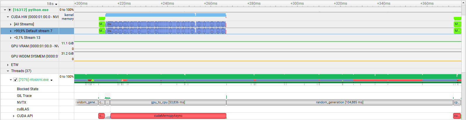 In the asynchronous case, model execution and random data generation overlap. The CPU and GPU work in parallel. However, as suspected, the GPU occasionally pauses during data transfers because everything is executed on a single stream. With multiple streams, transfers and computations could occur simultaneously, potentially improving performance (or at least, that’s my guess).