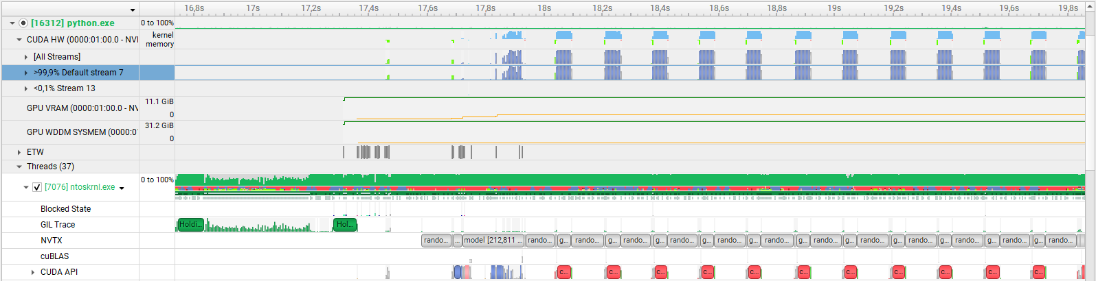 Here, the blocking calls related to data transfers are quite apparent. The CPU waits for the GPU’s results (which will be available at the end of the computation) before proceeding to the next iteration (and re-generating a batch of random data). When looking at a broader view of the execution, it becomes clear that the execution is “choppy.”
